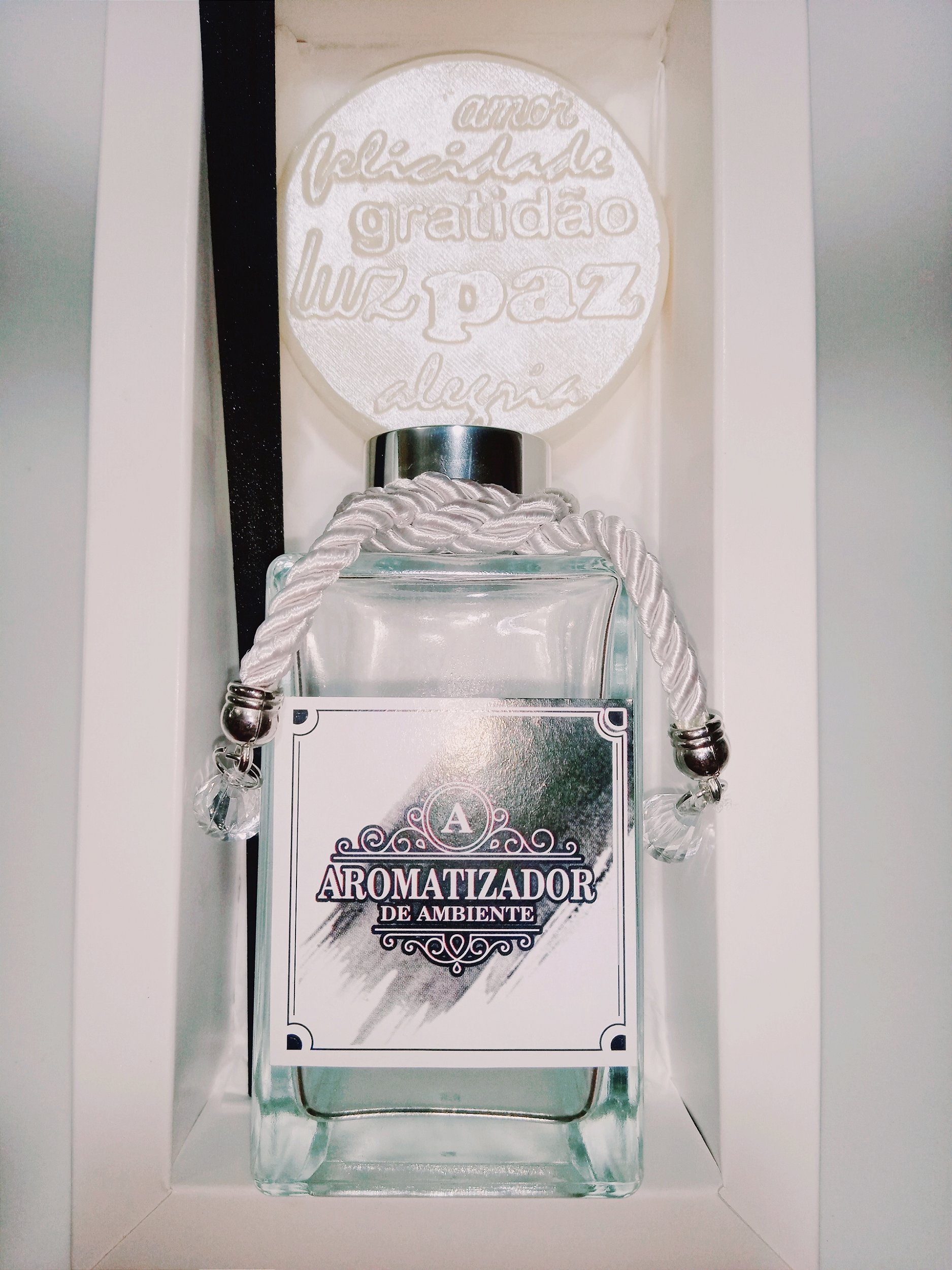 1 Aromatizador de Ambiente Vidro Square 170ml, com tampa de luxo, adornado com rótulo exclusivo e enfeite com cordão e pingente delicado.