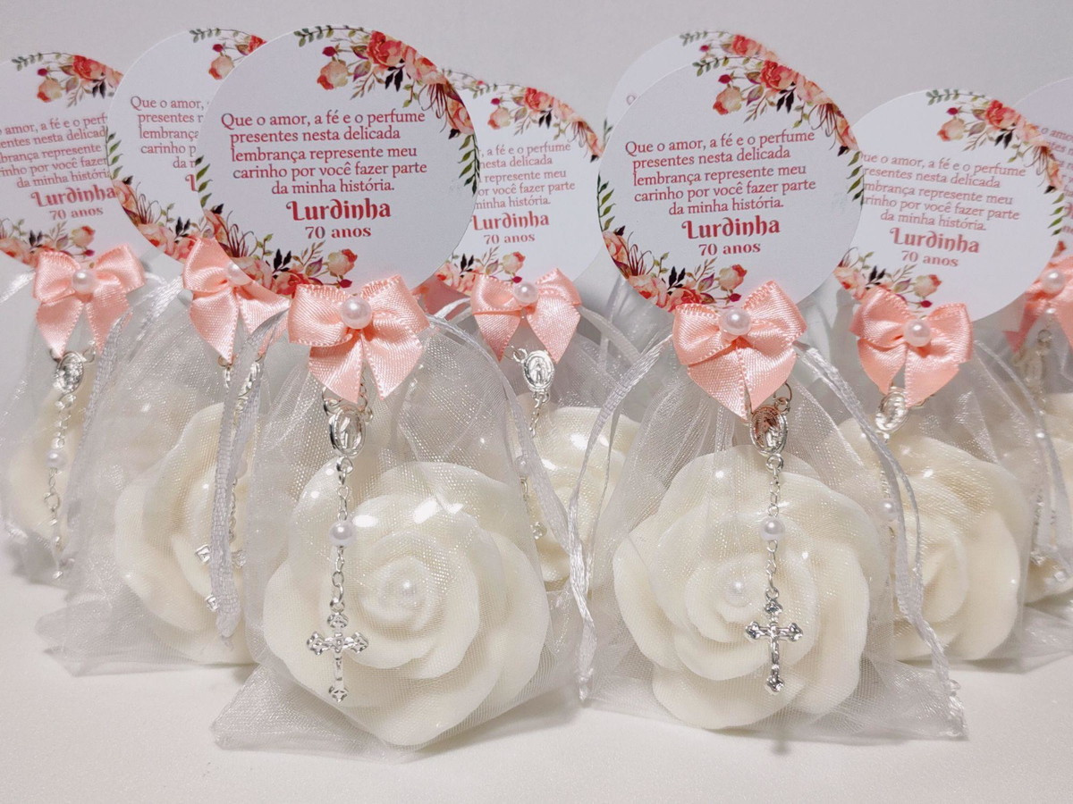 Lembrancinha 70 Anos: Sabonete Rosa Luxo com Mini Terço