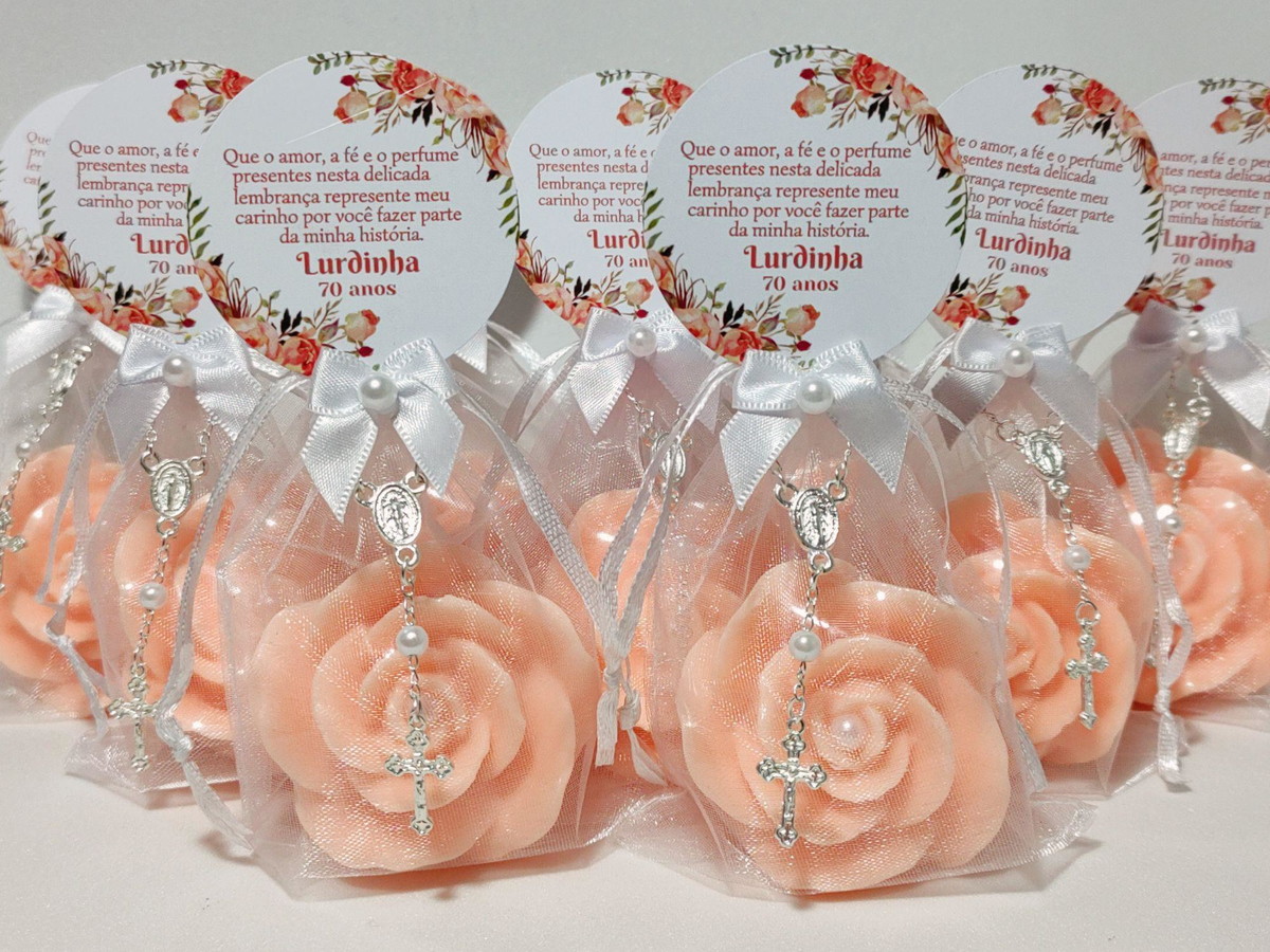 Lembrancinha 70 Anos: Sabonete Rosa Luxo com Mini Terço