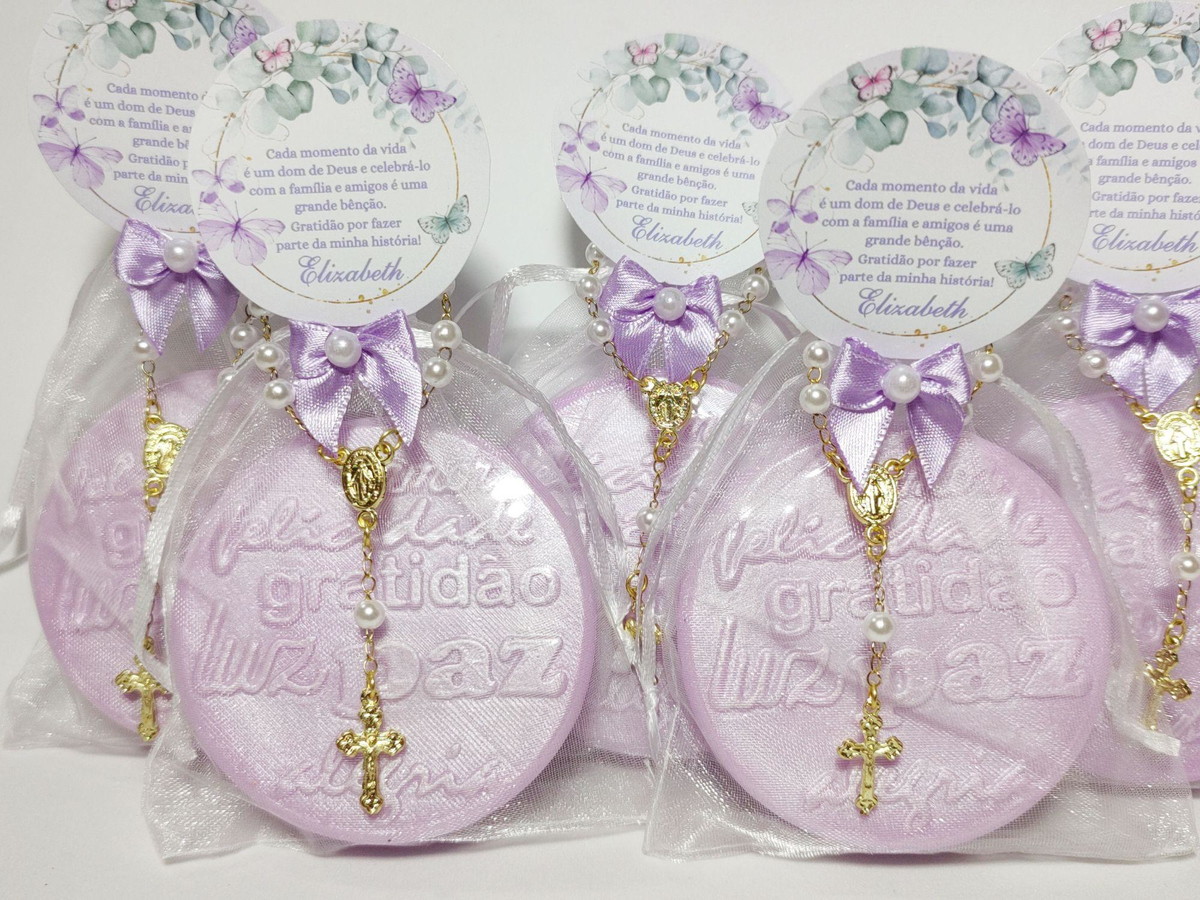 Lembrancinha Perfumada: Sabonete Redondo Desejos de Gratidão G com mini terço.
