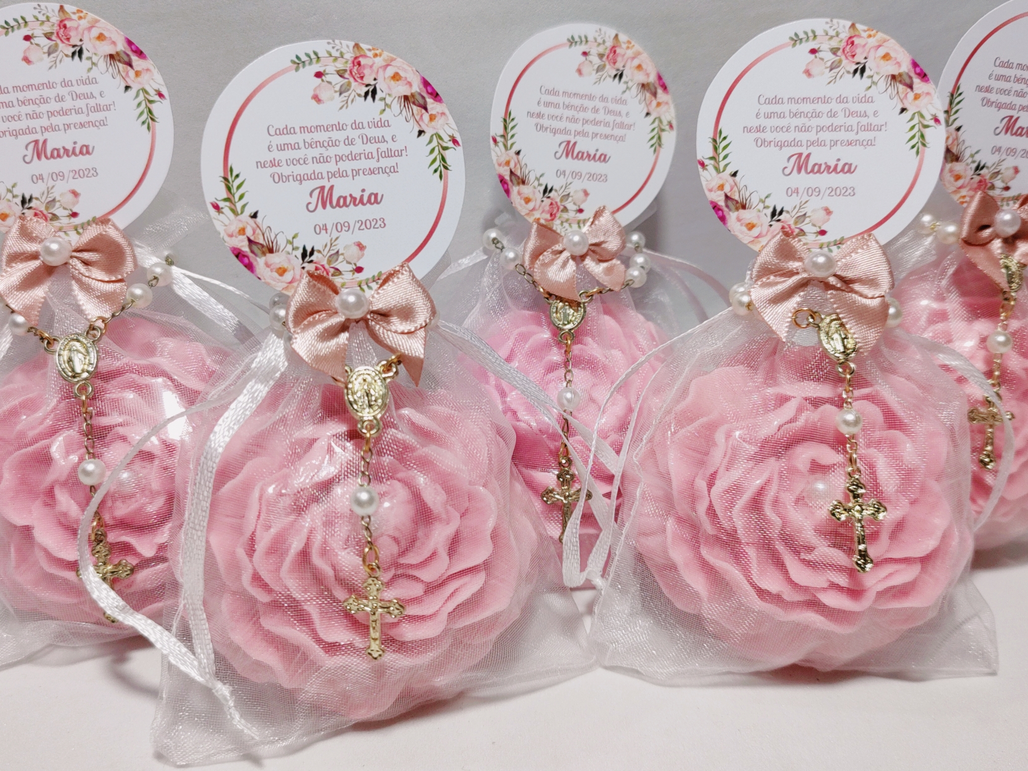 Cada sabonete Flor Peônia acompanha um mini terço.