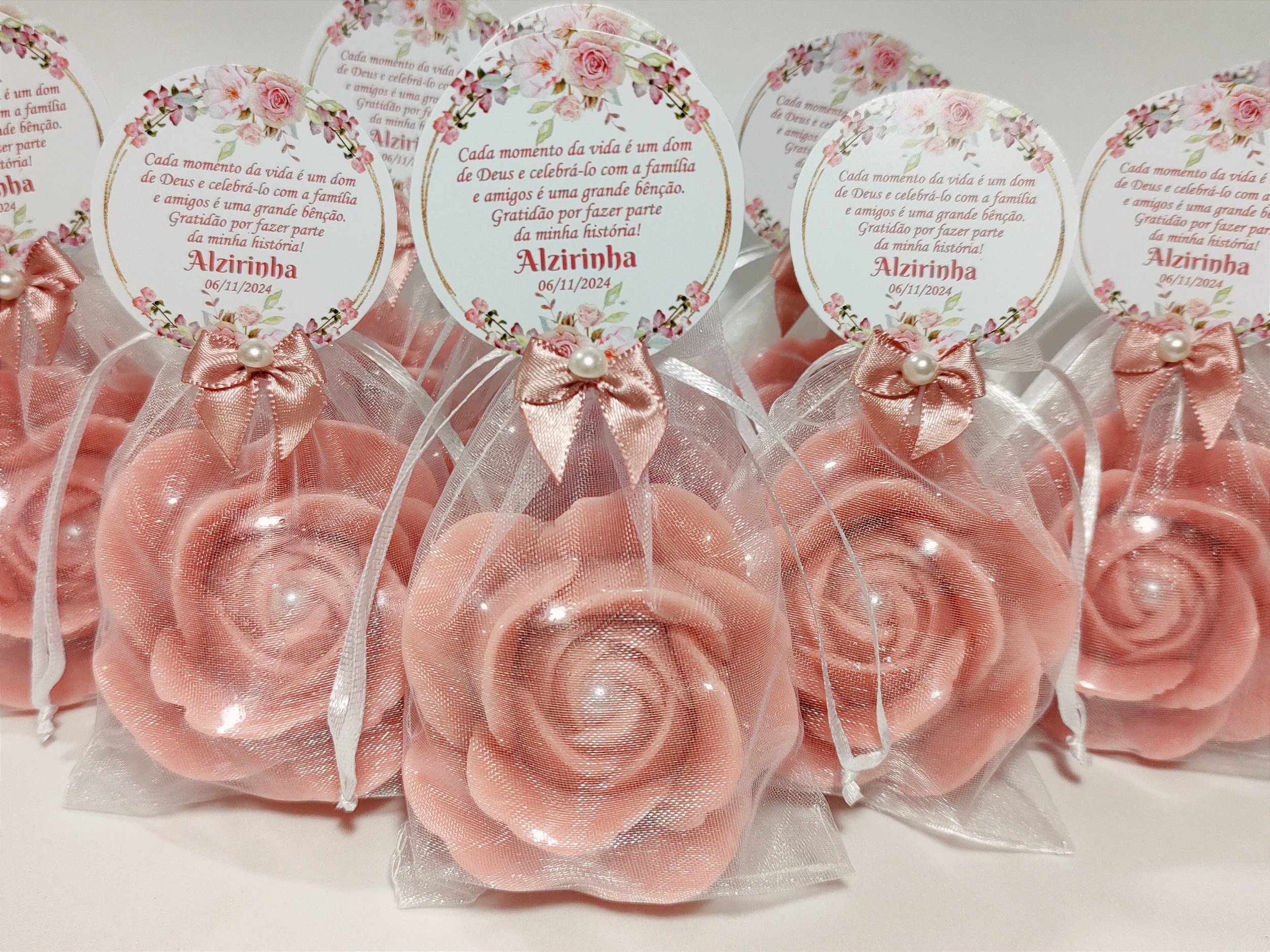 Nossa lembrancinha inclui um Sabonete Rosa Elegance Perfumada, totalmente personalizado para qualquer ocasião. Ajustamos as cores, dizeres e tema do cartãozinho (TAG) de acordo com sua preferência.