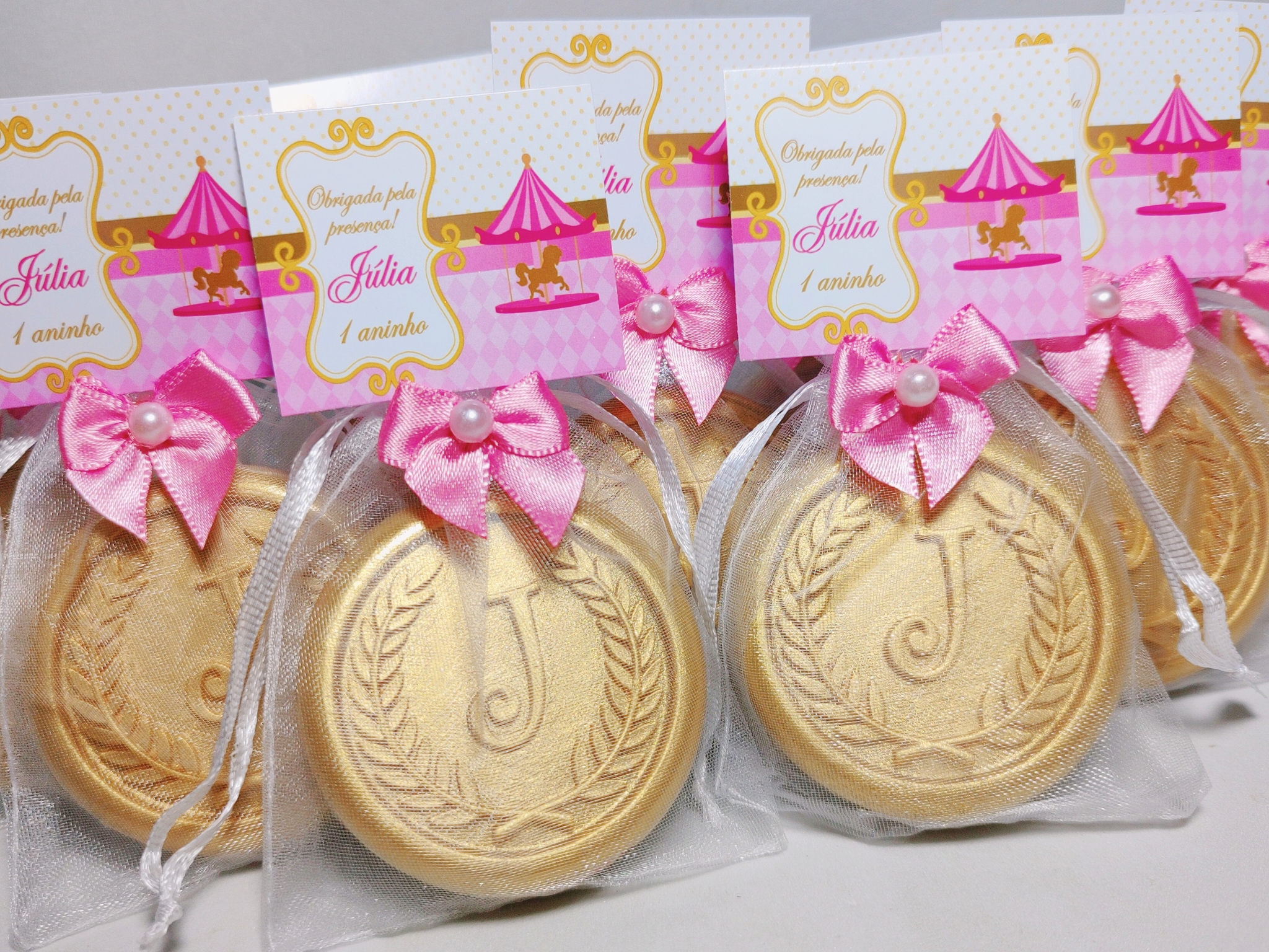 Os moldes dos sabonetes já são prontos com uma letra, portanto, não é possível adicionar mais de uma letra, brasão, logotipo ou outros desenhos diretamente no sabonete. No entanto, personalizações podem ser feitas na arte do cartãozinho e nas cores dos sabonetes e lacinhos.