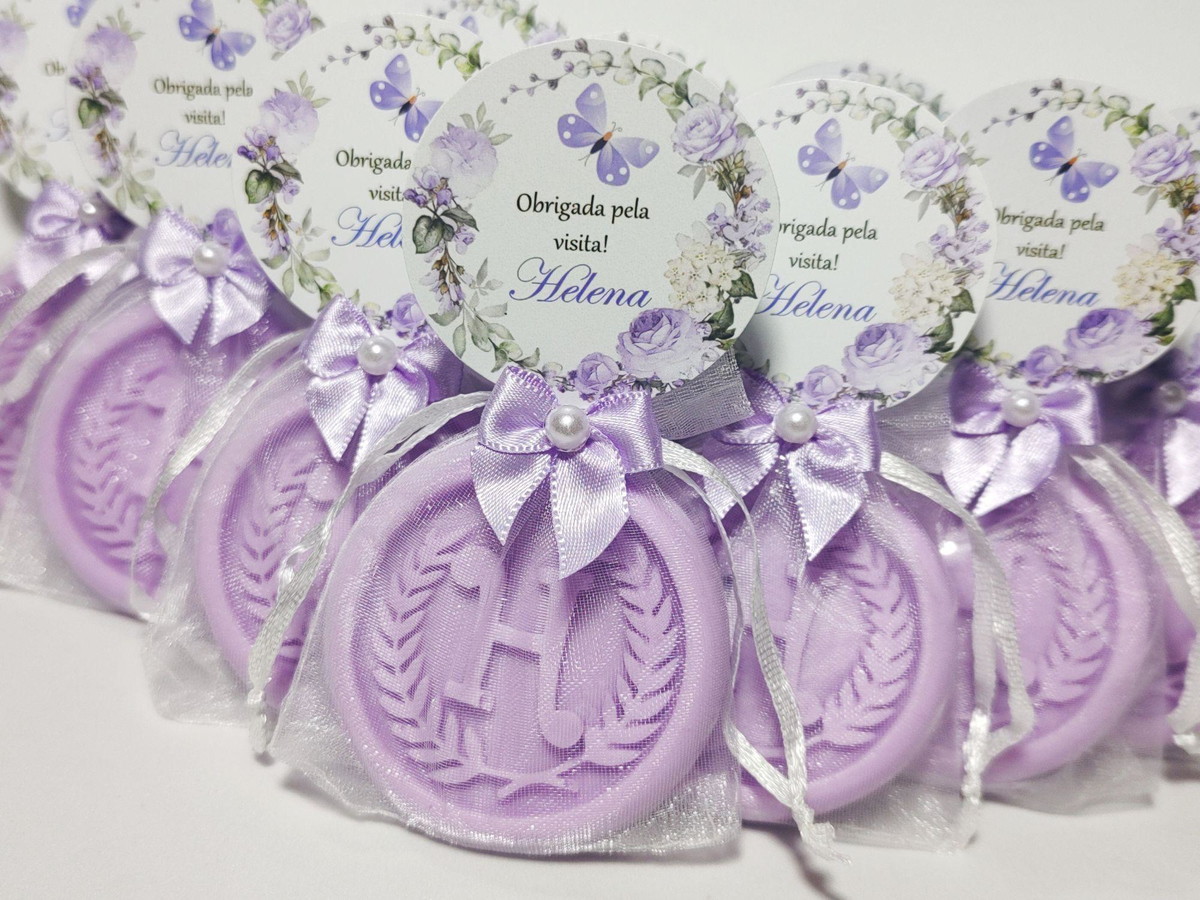 Os moldes dos sabonetes já são prontos com uma letra, portanto, não é possível adicionar mais de uma letra, brasão, logotipo ou outros desenhos diretamente no sabonete. No entanto, personalizações podem ser feitas na arte do cartãozinho e nas cores dos sabonetes e lacinhos.