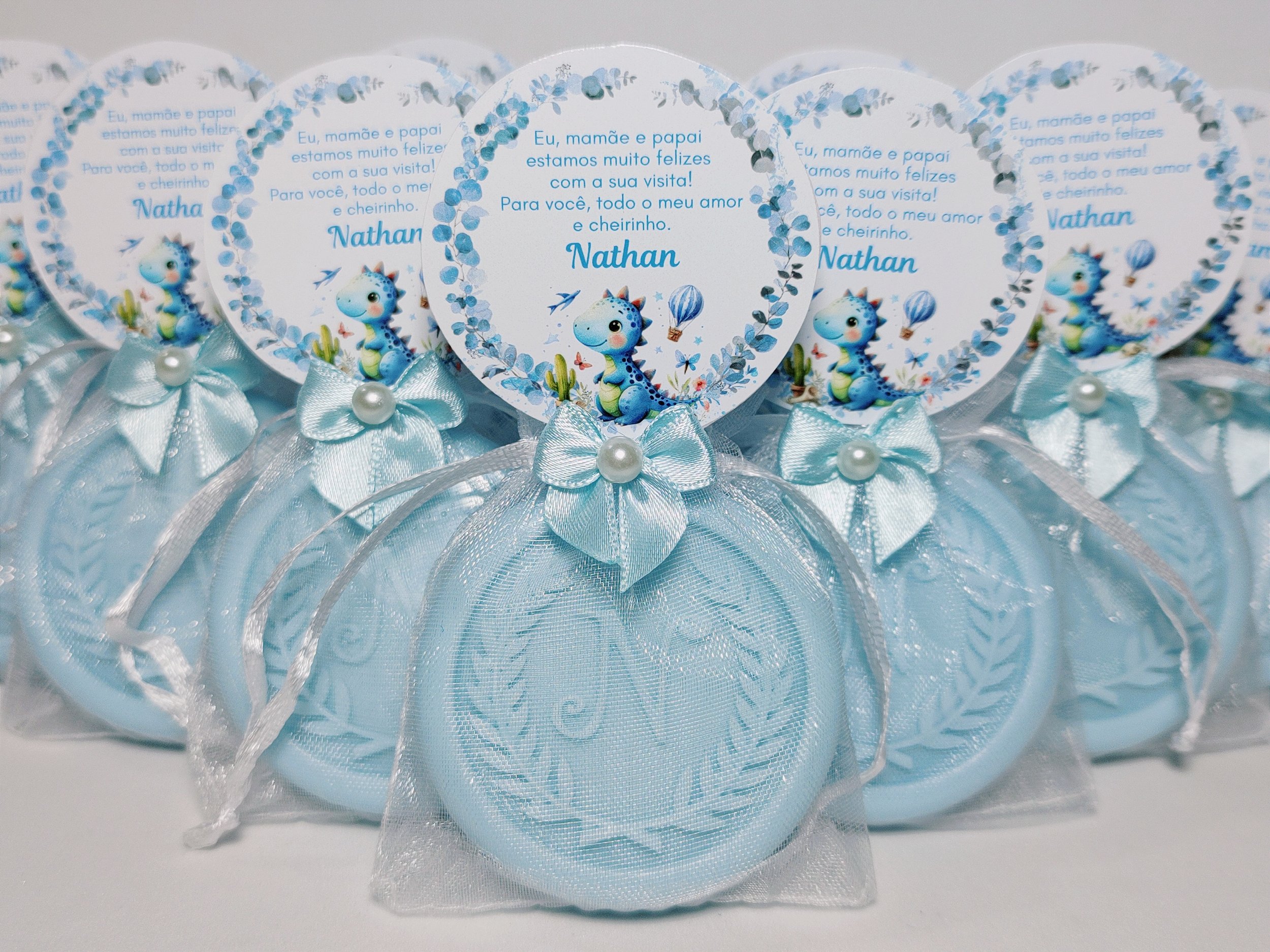 Os moldes dos sabonetes já são prontos com uma letra, portanto, não é possível adicionar mais de uma letra, brasão, logotipo ou outros desenhos diretamente no sabonete. No entanto, personalizações podem ser feitas na arte do cartãozinho e nas cores dos sabonetes e lacinhos.