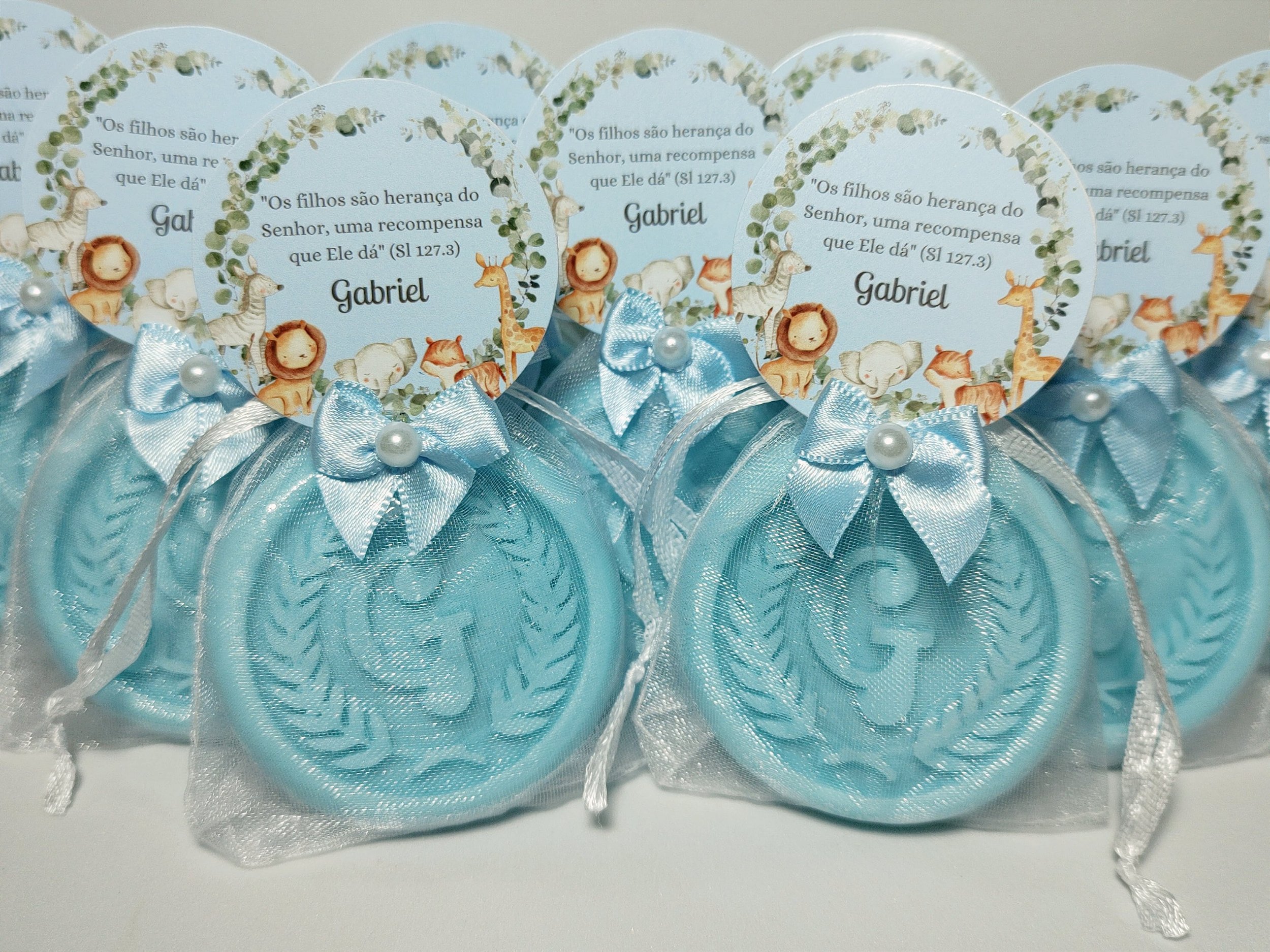 Os moldes dos sabonetes já são prontos com uma letra, portanto, não é possível adicionar mais de uma letra, brasão, logotipo ou outros desenhos diretamente no sabonete. No entanto, personalizações podem ser feitas na arte do cartãozinho e nas cores dos sabonetes e lacinhos.