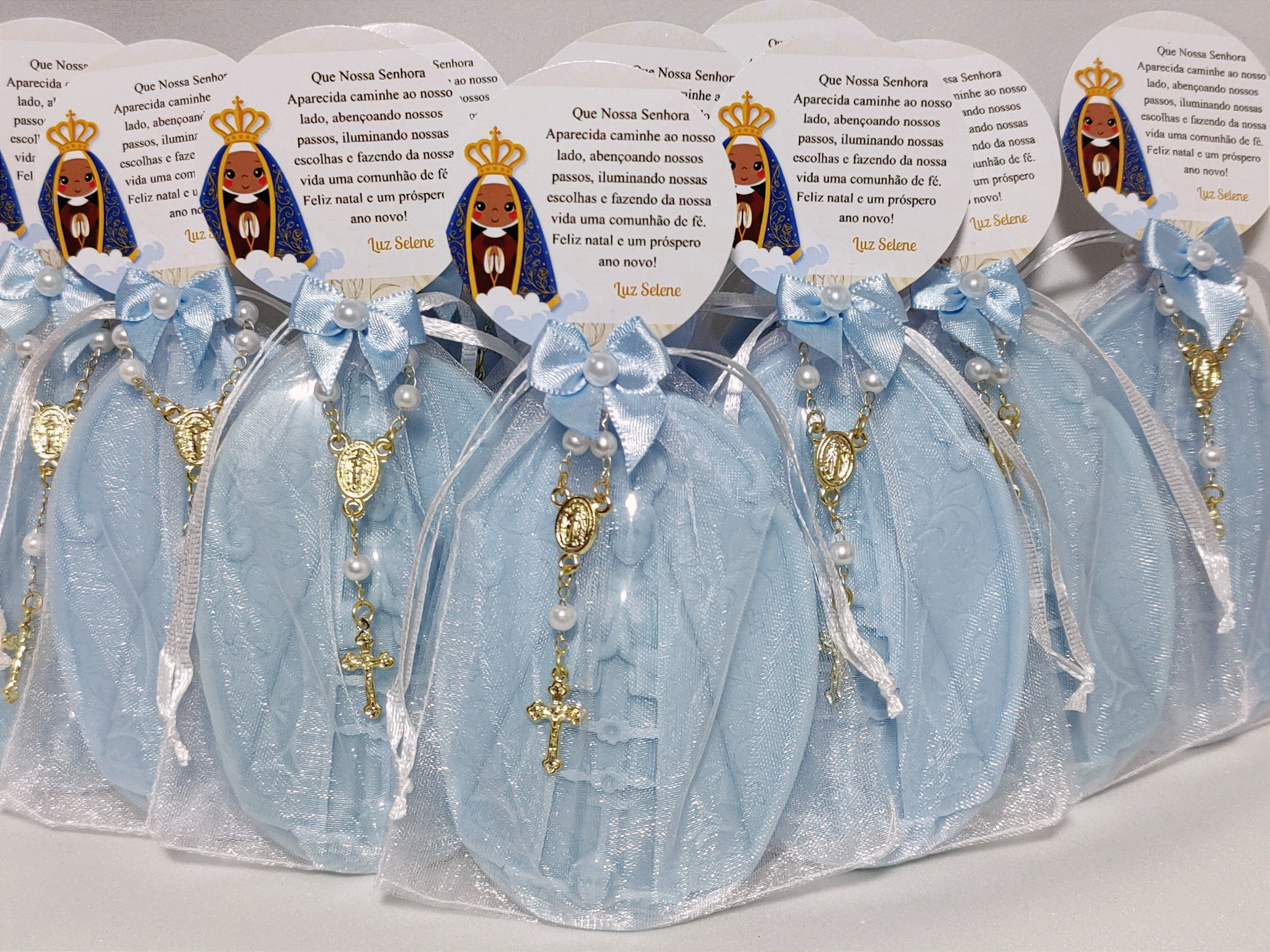 Transforme sua celebração em um momento inesquecível com as nossas lembrancinhas personalizadas! O Sabonete Nossa Senhora com mini terço é a escolha perfeita para transmitir delicadeza e gratidão aos seus convidados.