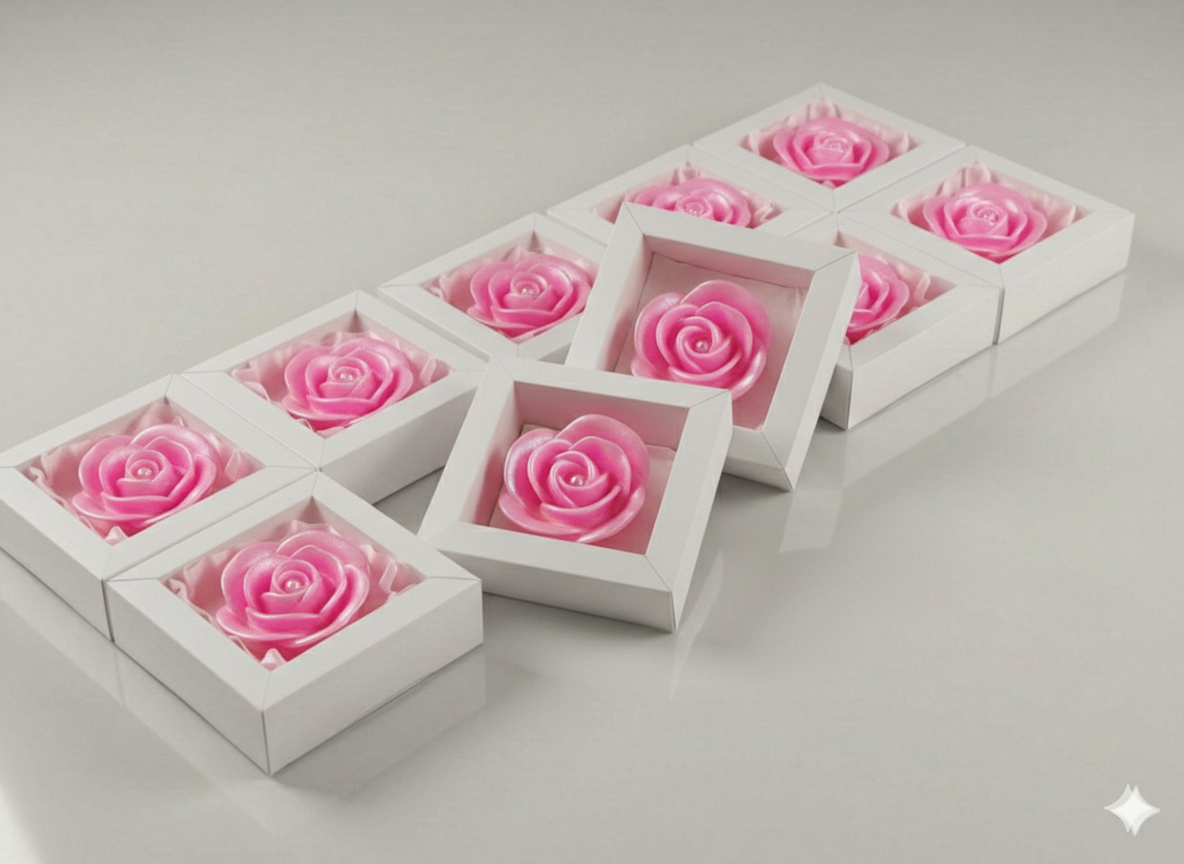 Nossa lembrancinha é composta por um sabonete artesanal em formato de Rosa Provençal, cuidadosamente acondicionado em uma caixinha de papel cartão com tampa de acetato, que valoriza ainda mais a apresentação.